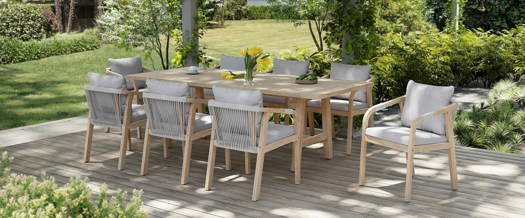 Mori Wooden Outdoor Furniture Set with Rope Design; 7.5'' Thick Cushions; 4-7 Seats
