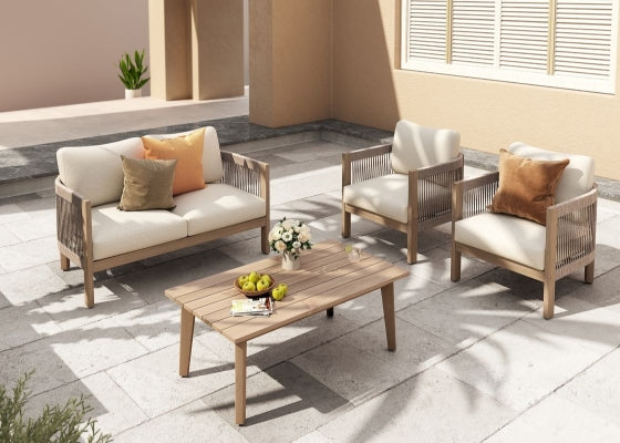 Drift 4-Piece Eucalyptus Wooden Outdoor Furniture Set with Linen-tone Cushions, Angled seat, Rope Backrest