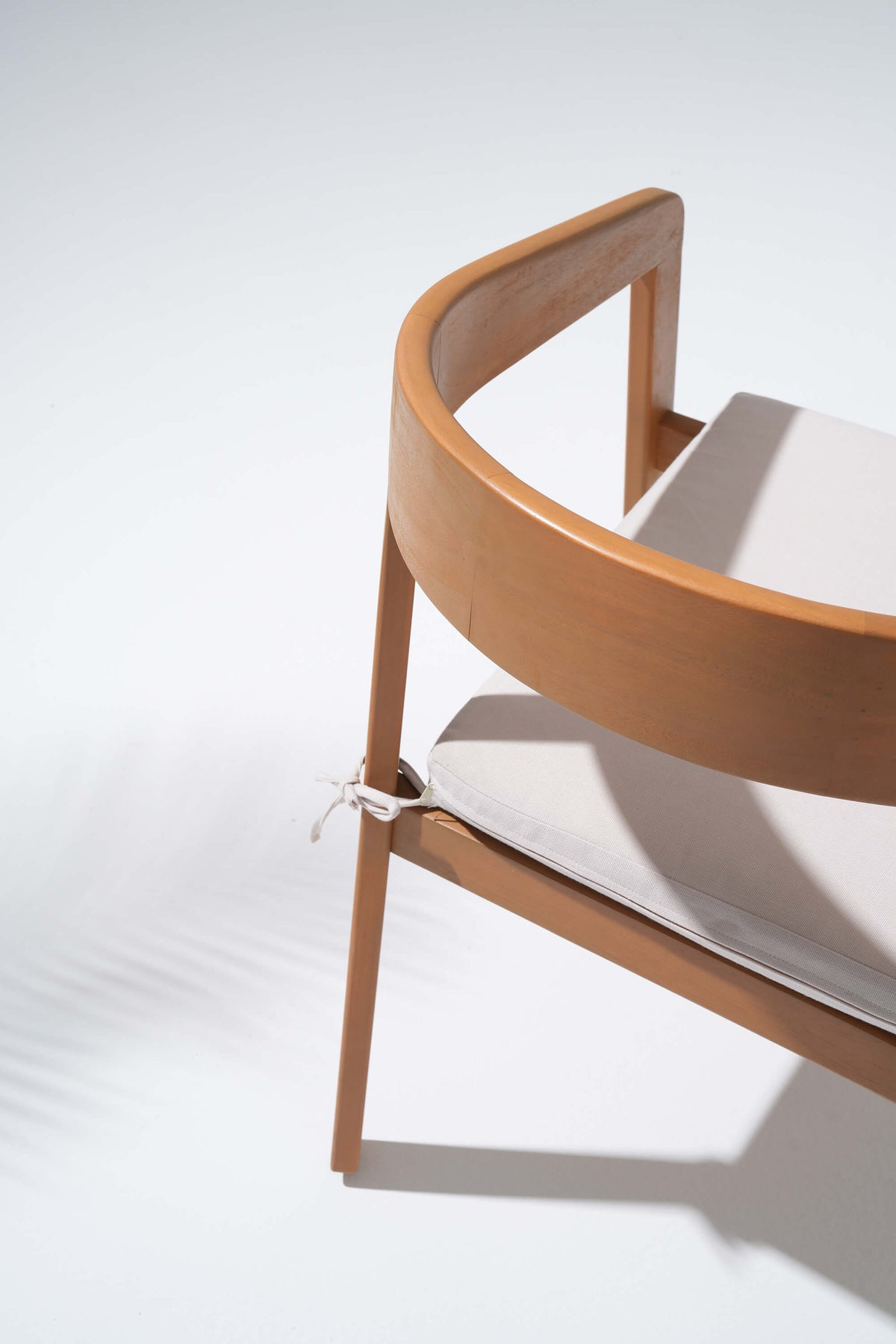 Wooden chair with white cushions, curved backrest detail - SUNSITT’s Modern Premium Outdoor Furniture