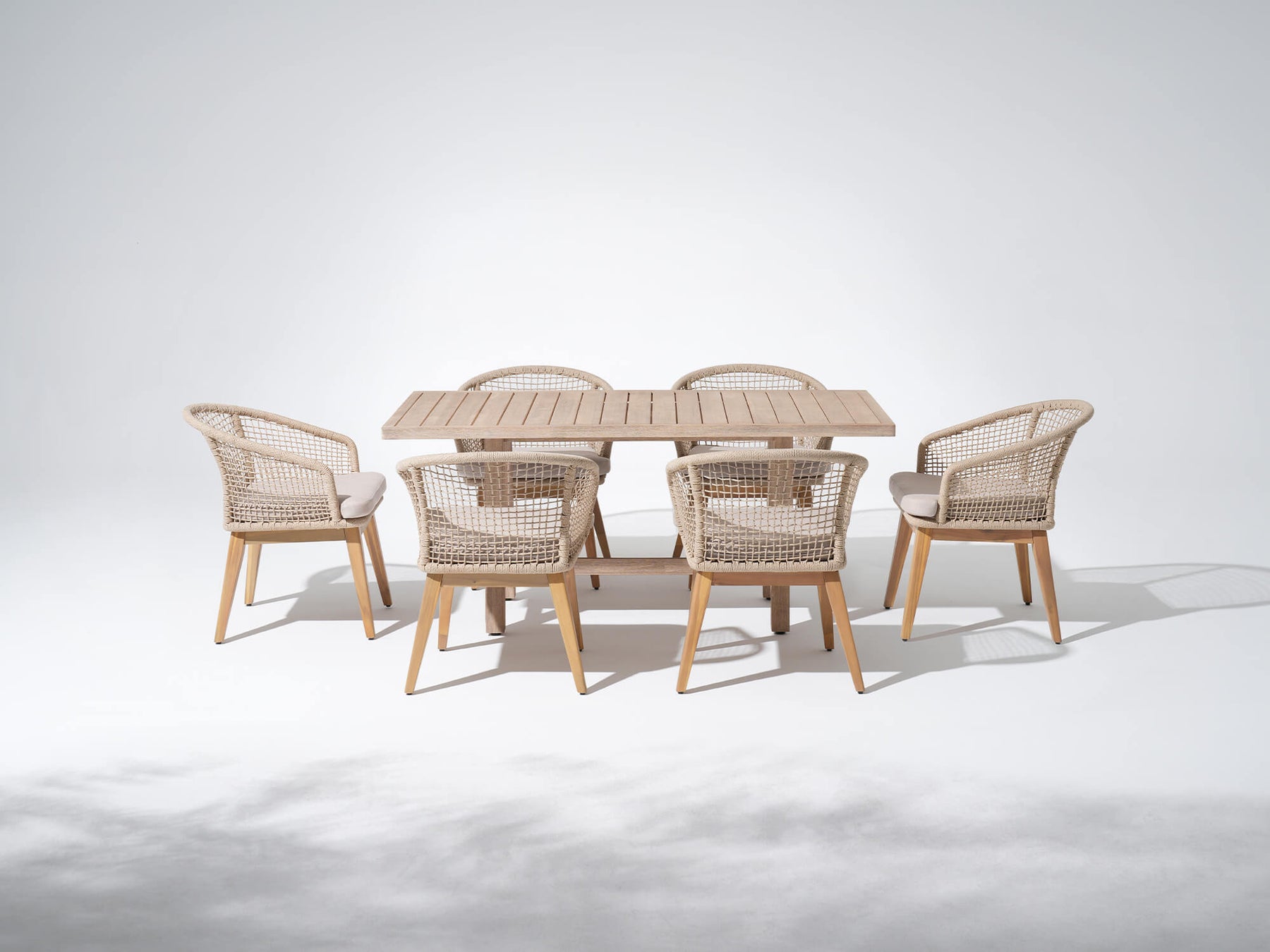 The 7-piece set pairs six roomy armchairs with a matching rectangular dining table, offering ample space for family gatherings or al fresco brunches.