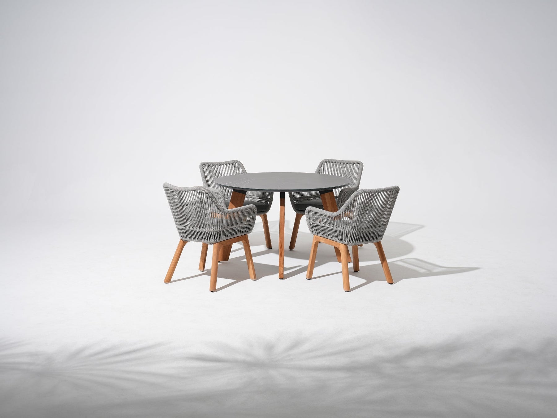 Perfectly complement the Round Laguna Dining Table with four Coronado Dining Chairs. Enjoy comfort and style indoors or outdoors. Luxurious acrylic fabric cushions resist stains, while teak wood legs offer durability. Enhance smaller venues with this versatile set, ideal for intimate gatherings and casual dining experiences.