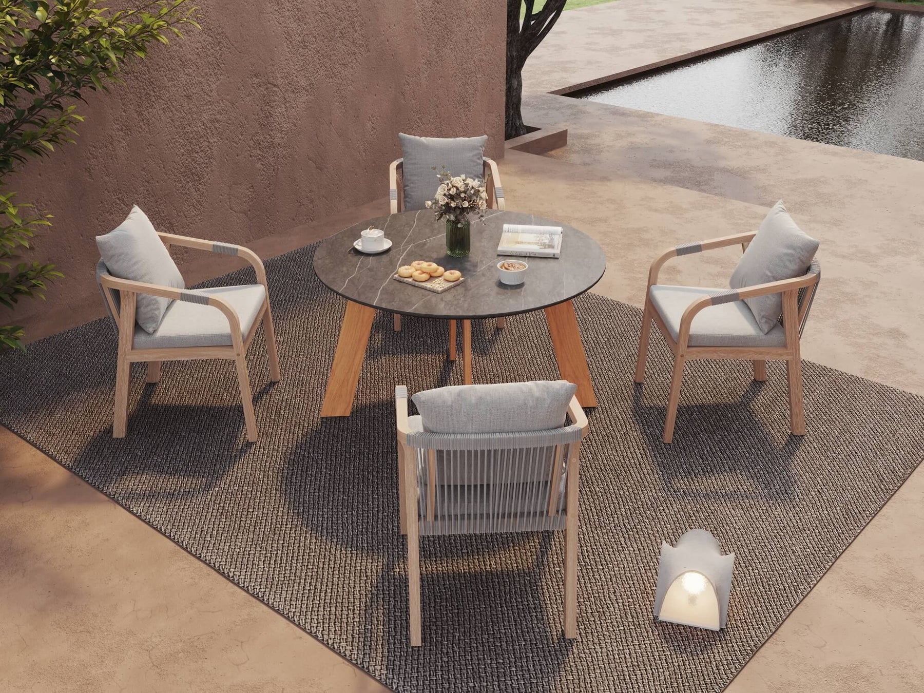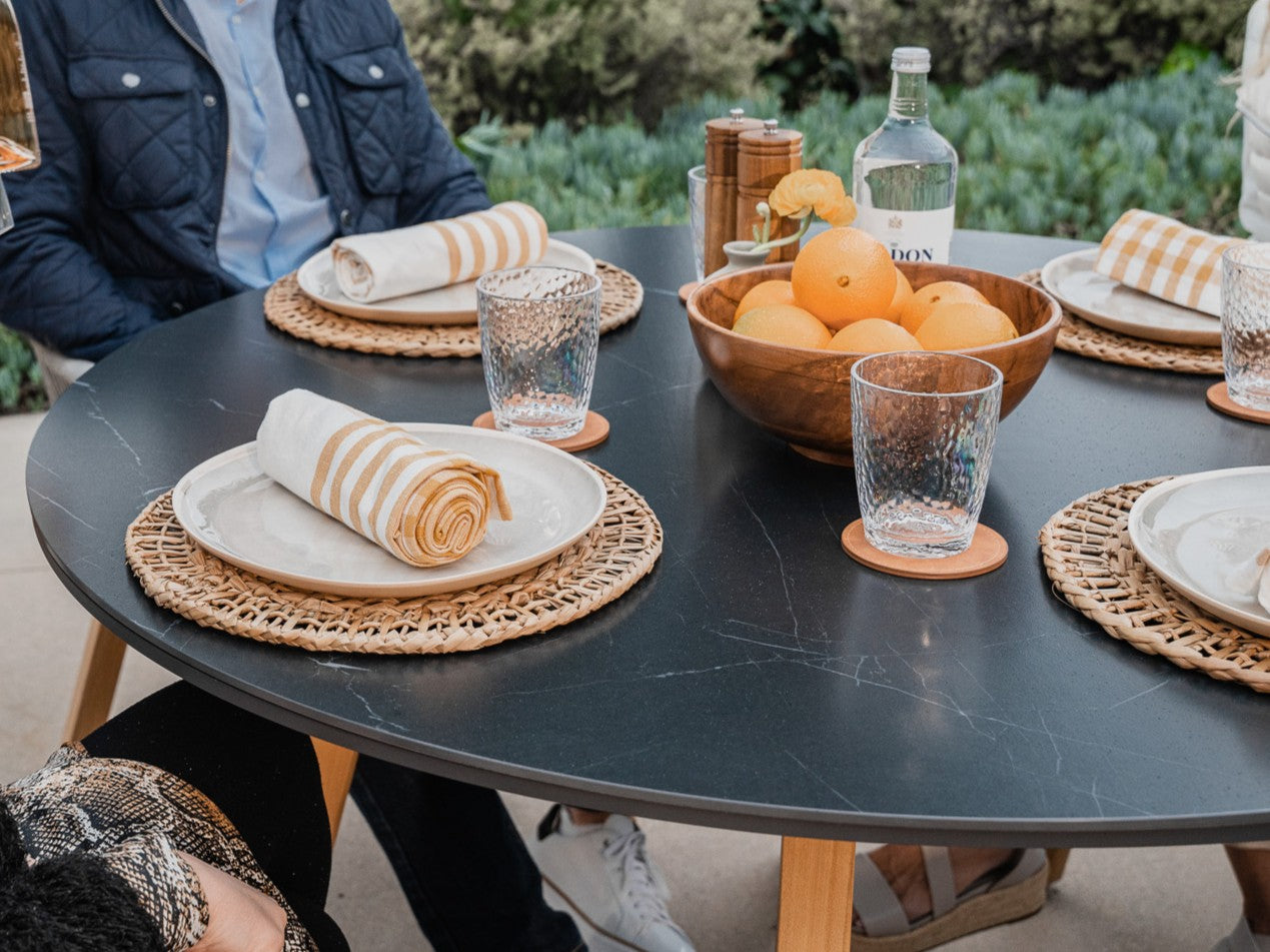 1 x Plena Round Dining Table- Think outside the box—the Round (Plena Dining Table brings a circular experience to your great outdoors or home. Sized for dinner, drinks or snacks for a more intimate party, it works comfortably with four Dining Chairs. Teak wood legs and sintered stone tabletop make this small but stunning dining or picnic table a perfect addition to smaller venues.