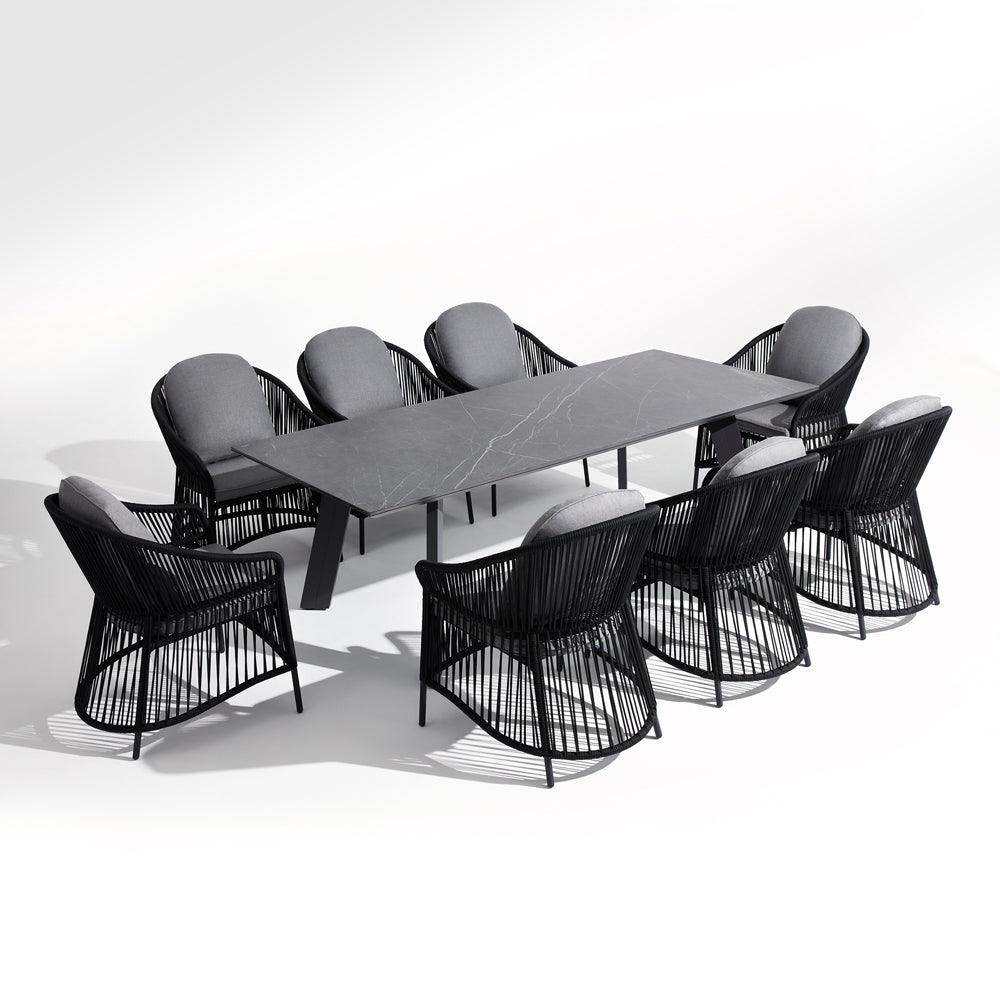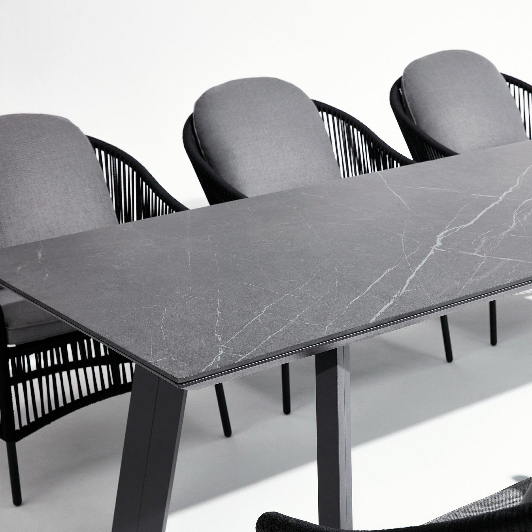 Call it a dining chair —it’s an absolute joy to sit back, relax and take in the great outdoors, or elevate your indoor setting, with the Lombard Lounge Chair. Feel the Wonder Collection difference with our specially blended four-layered acrylic fabric, designed for the ultimate in luxury and long life, treated to protect against sun fading, spills, weather and mold. Black textiline rope accents take an already elegant outdoor patio chair to the very next level. Set the stage for a stylish dining event with the Mission Dining Table. Defined by long lines and sintered stone—and a dark grey finish—this outdoor dining table is generously sized for six guests and plenty of room for culinary treats. The perfect complement to Golden Gate outdoor dining chairs.