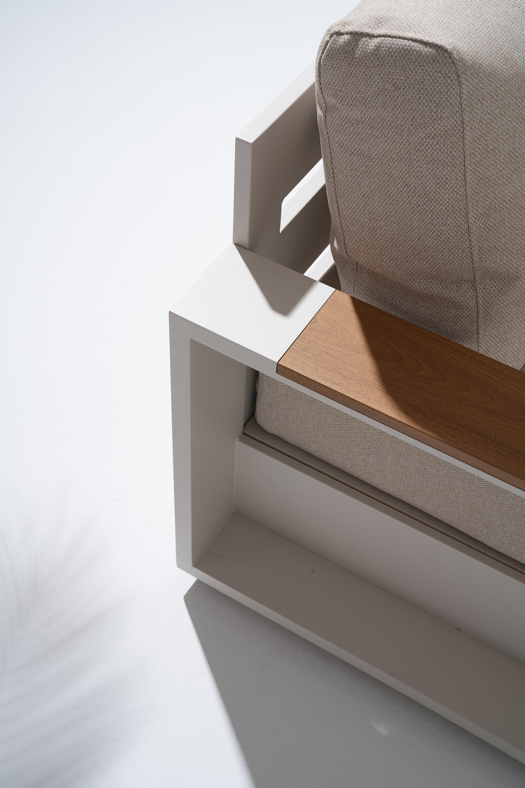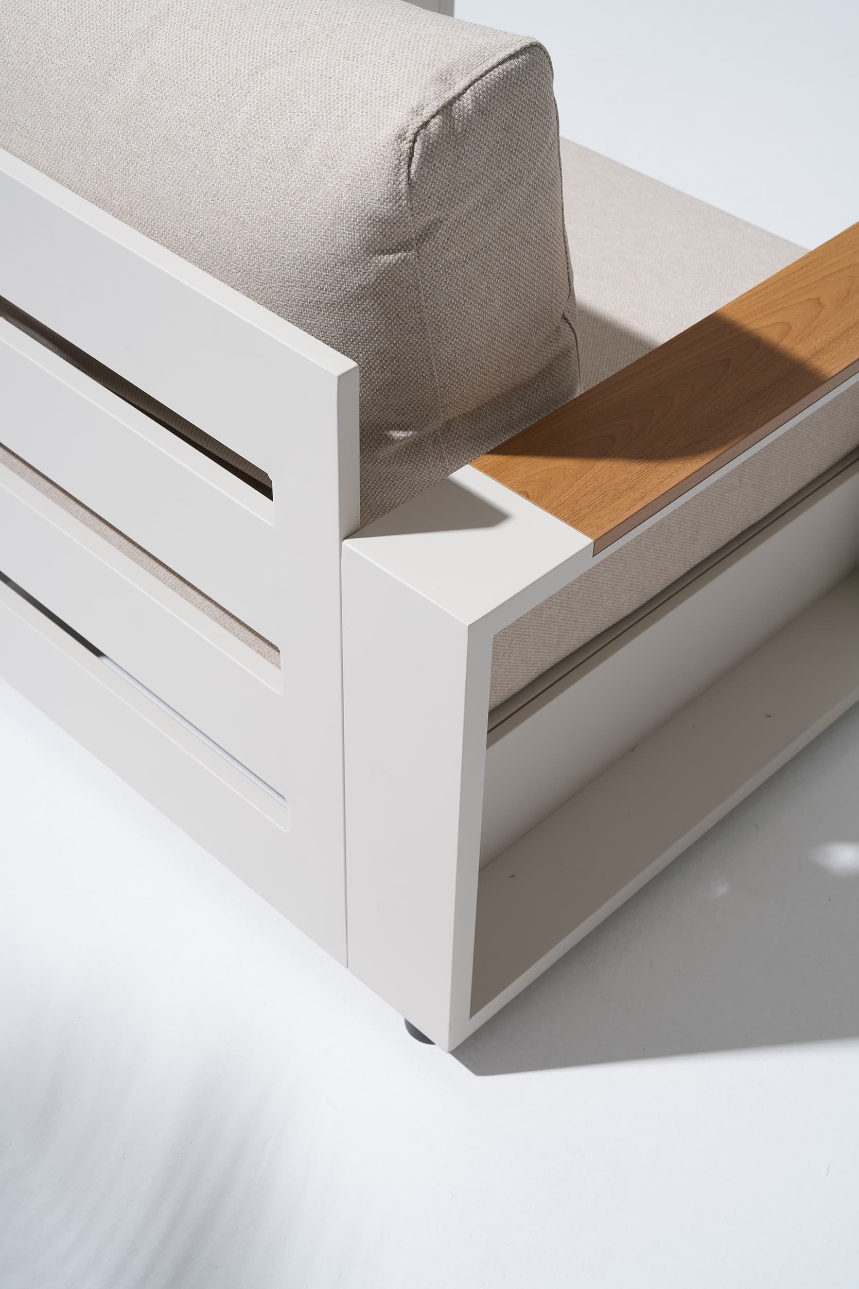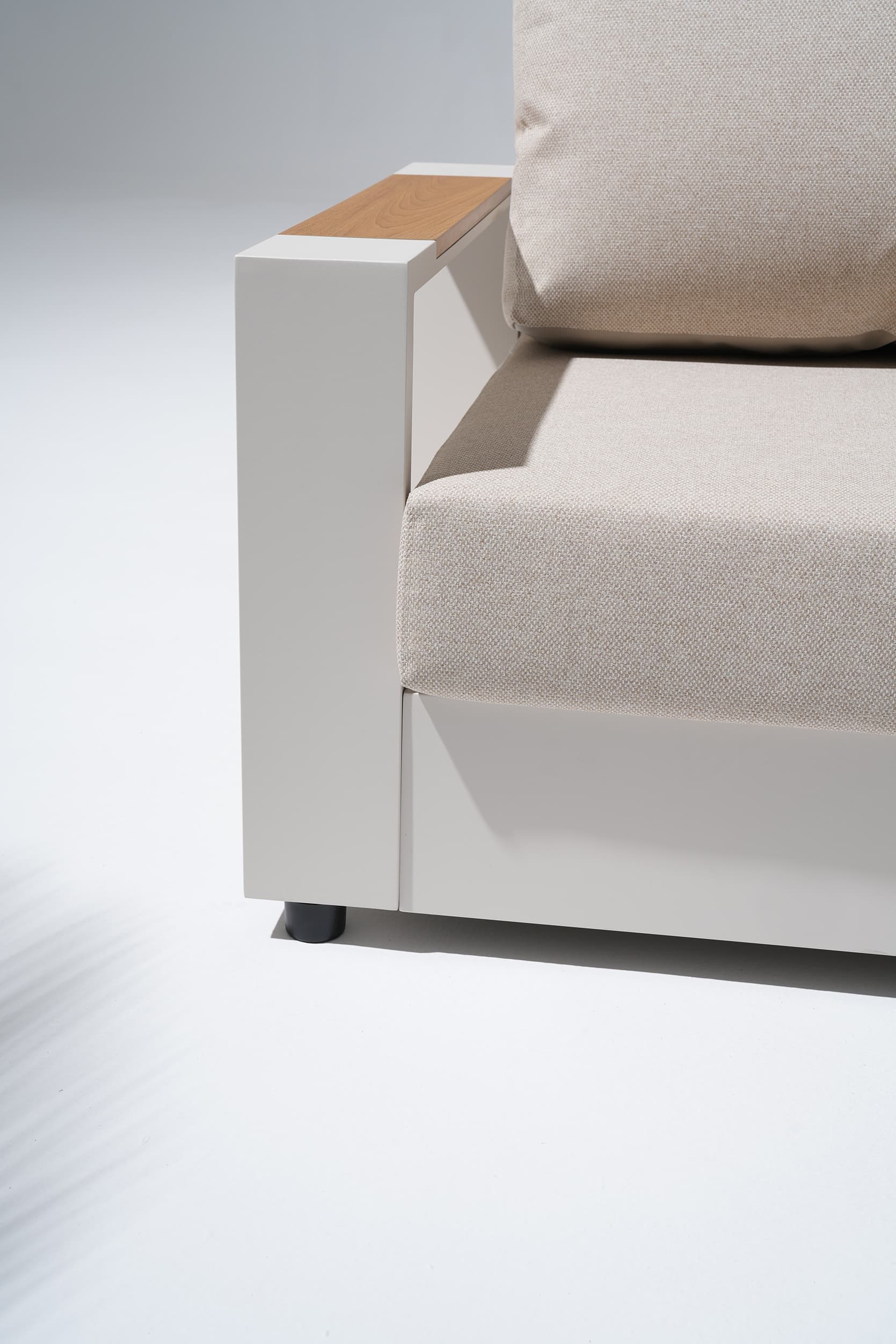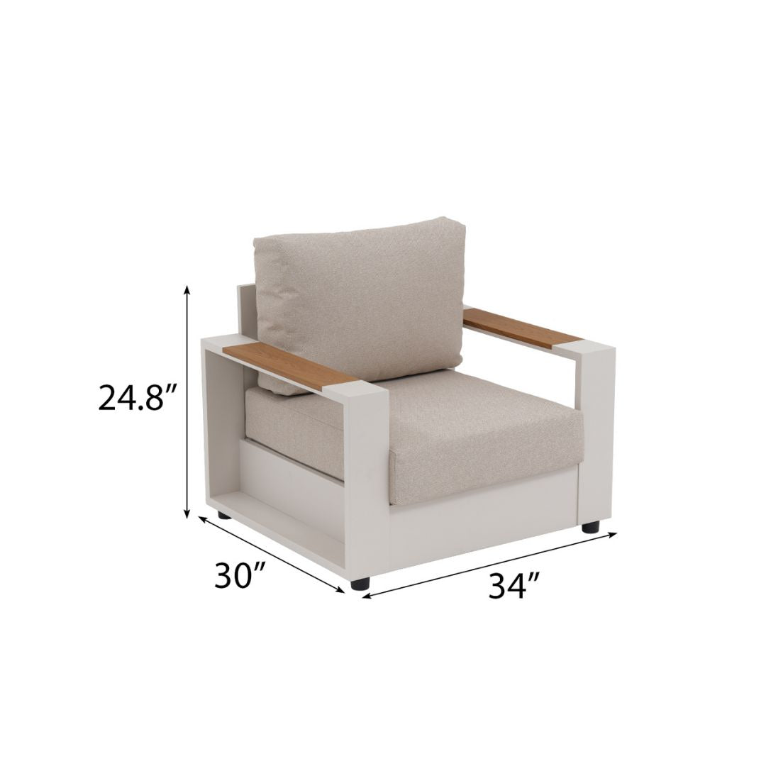 Addison is more than furniture—it’s a feeling. Revel in the golden outdoors as the Addison modern sofa set transforms your space into a sanctuary of serenity—crafted with a champagne powder-coat finish and natural wood armrests for elegant durability, paired with cloud-like white cushions that invite you to unwind, creating the perfect balance of refined style and laidback comfort for cherished moments under the open sky.