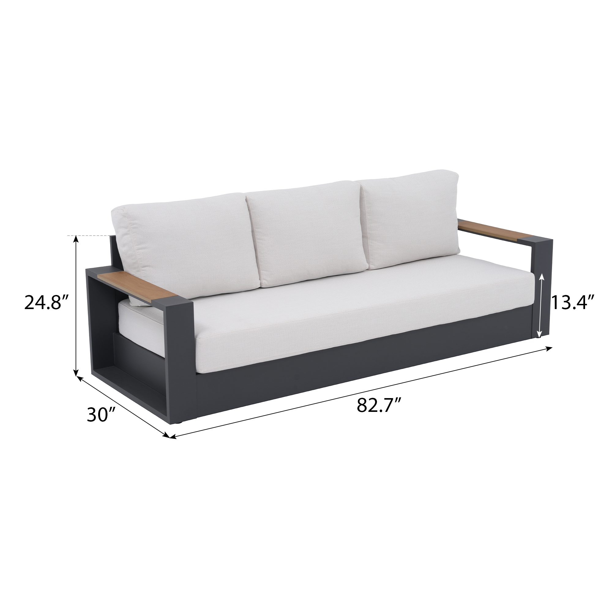 Addison is more than furniture—it’s a feeling. Revel in the golden outdoors as the Addison modern sofa set transforms your space into a sanctuary of serenity—crafted with a dark grey aluminum frame and natural wood armrests for elegant durability, paired with cloud-like white cushions that invite you to unwind, creating the perfect balance of refined style and laidback comfort for cherished moments under the open sky.