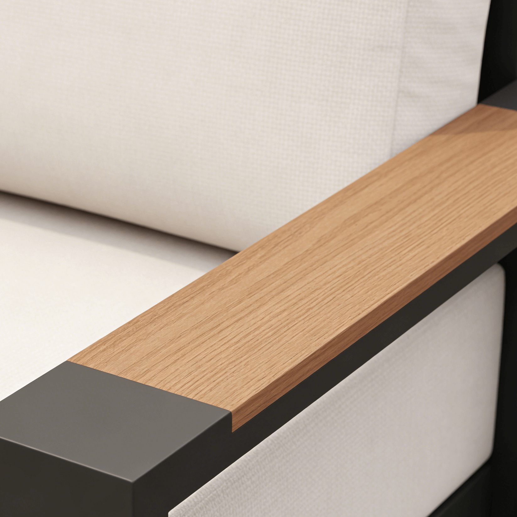 Addison is more than furniture—it’s a feeling. Revel in the golden outdoors as the Addison modern sofa set transforms your space into a sanctuary of serenity—crafted with a dark grey aluminum frame and natural wood armrests for elegant durability, paired with cloud-like white cushions that invite you to unwind, creating the perfect balance of refined style and laidback comfort for cherished moments under the open sky.