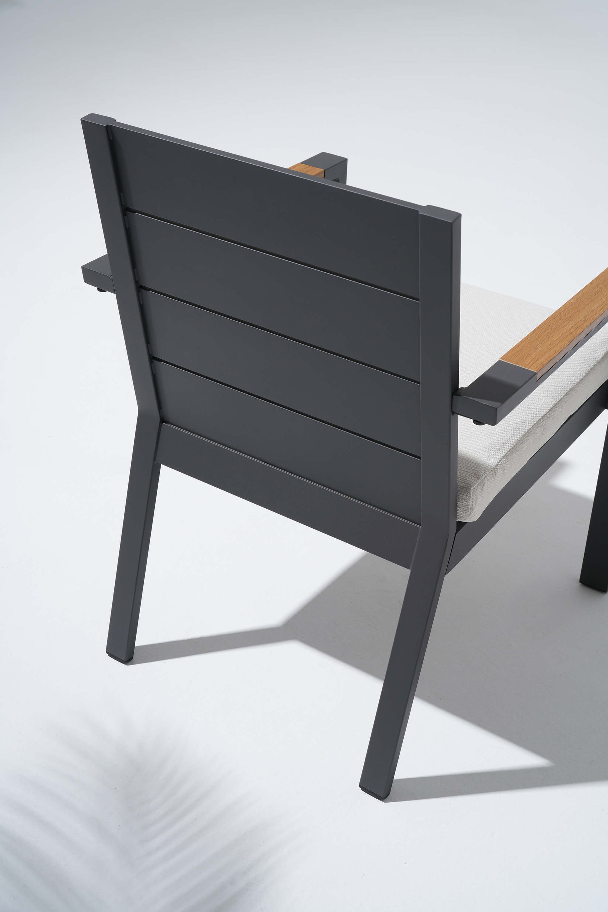 Addison brings a refined, architectural ease to outdoor dining. A lightweight dark grey aluminum frame pairs with a composite wood tabletop, offering the warmth of natural grain with effortless durability. Soft olefin cushions add quiet comfort, while an integrated umbrella hole invites shade into long, unhurried meals. Clean lines, open proportions, and a calm, cohesive presence—designed to live beautifully outdoors.