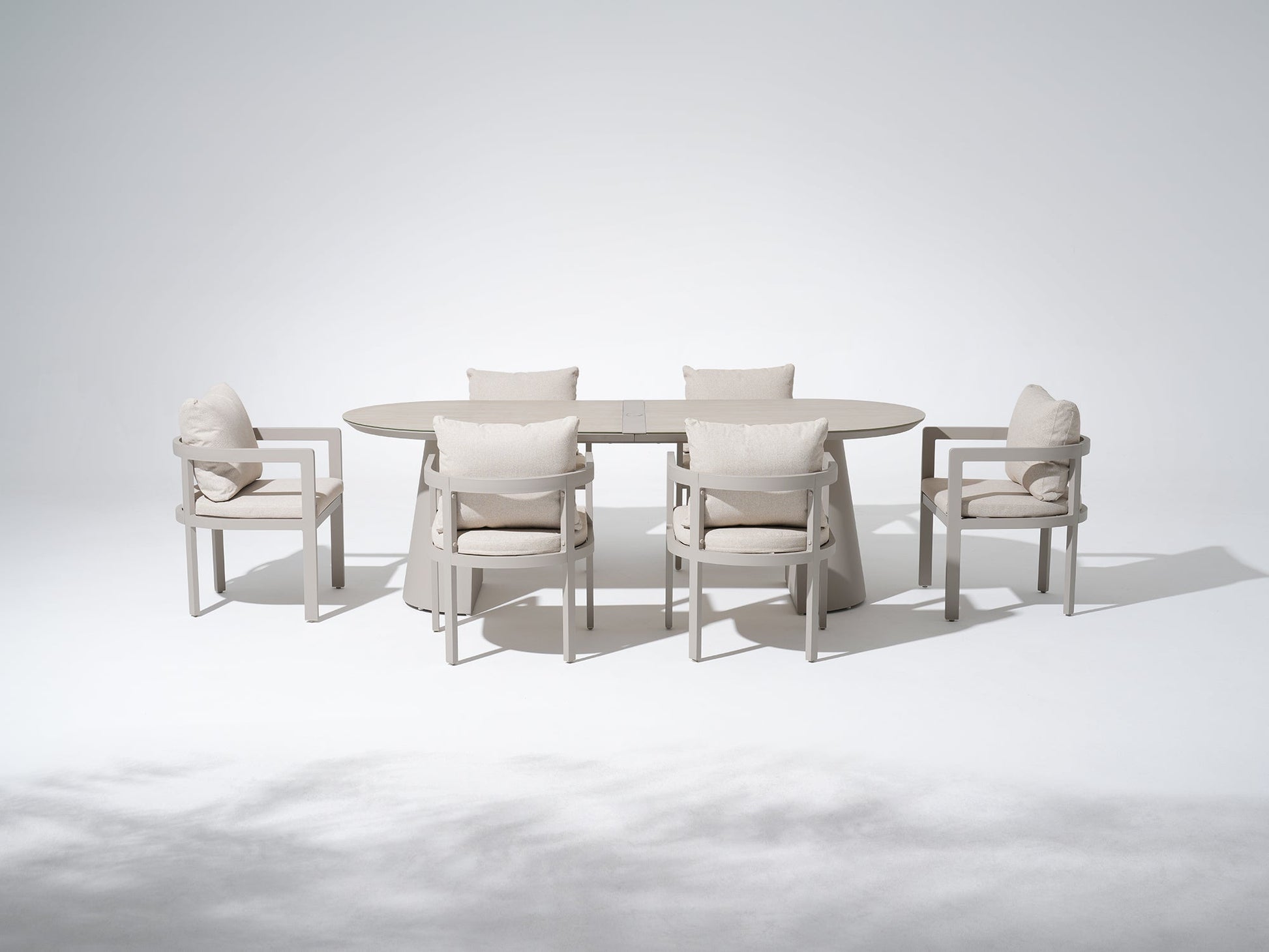 The Addison dining set reimagines outdoor dining with a calm, tonal palette and clean modern lines. A softly contoured table meets refined armchairs wrapped in plush cushions, offering comfort that feels relaxed yet intentional. Its light finish brightens the space while maintaining a grounded, architectural presence. Perfectly coordinated with the Addison sofa set, this dining arrangement brings harmony to open-air living—where every seat feels welcoming and every moment feels unhurried.