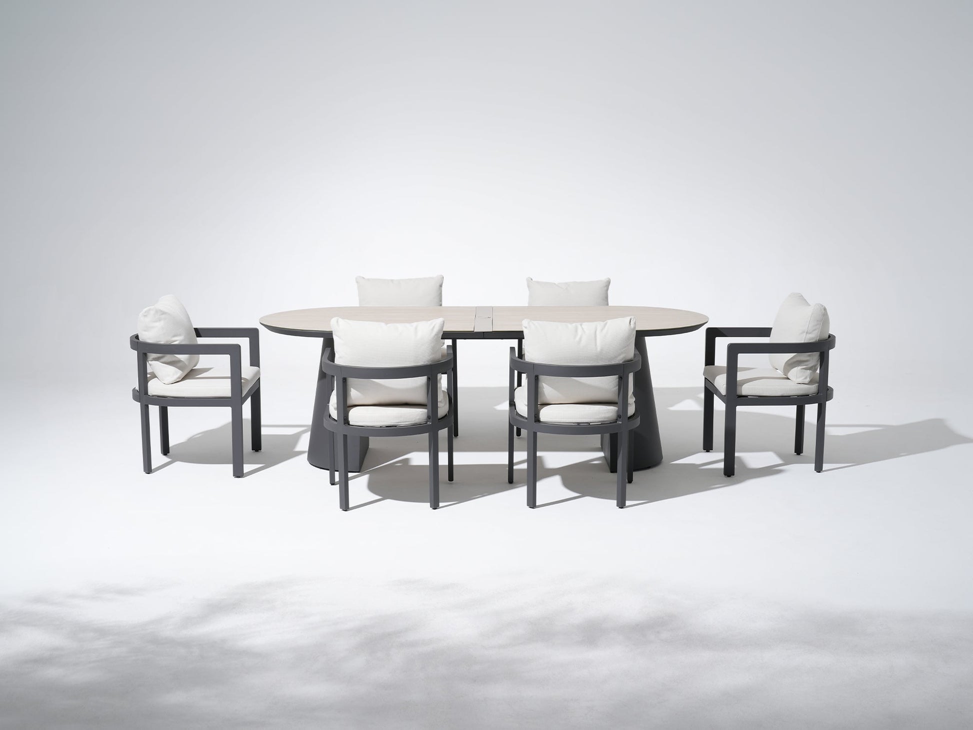 Addison elevates outdoor dining with a modern, architectural presence. The dining set features a sculptural table paired with clean-lined armchairs, crafted in a dark grey aluminum frame and finished with plush, tailored cushions. Balanced proportions and an open silhouette create a setting that feels grounded yet airy—designed to gather effortlessly. Seamlessly coordinated with the Addison lounge collection, it brings cohesion and calm to refined outdoor living.
