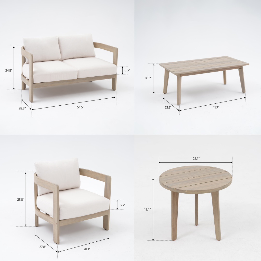 Cali Wooden Outdoor Loveseat Set with Mixed Tables, Creamy Cushions
