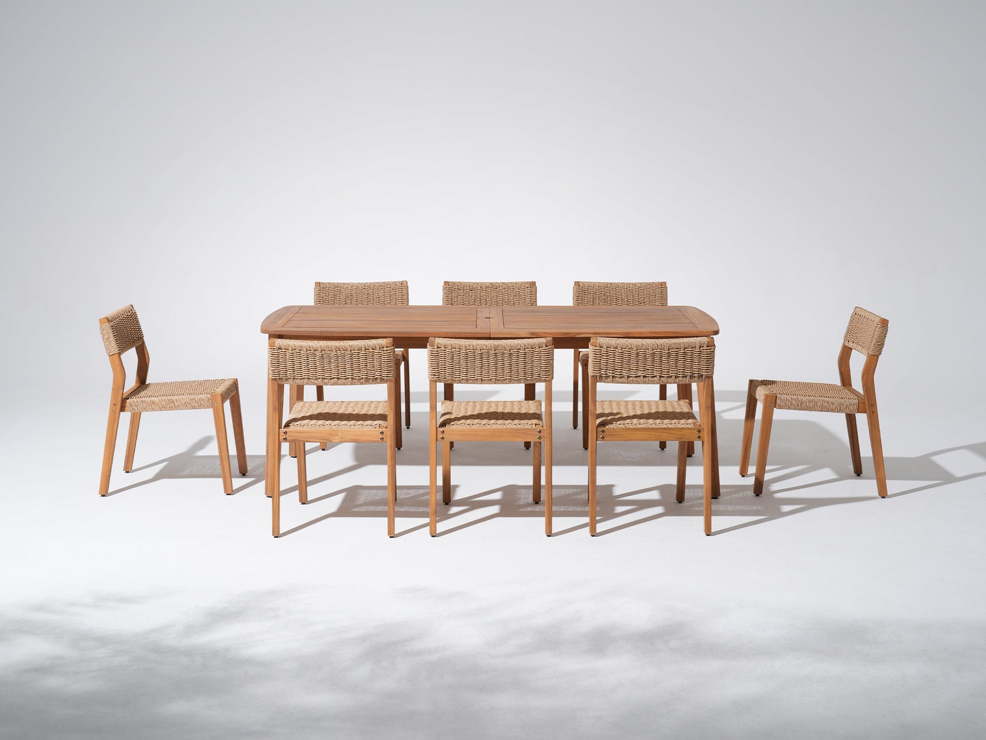 Nalia Outdoor Wood Dining Set with 8 Chairs, Armless Design, Umbrella Hole, 83" Tapered Legs